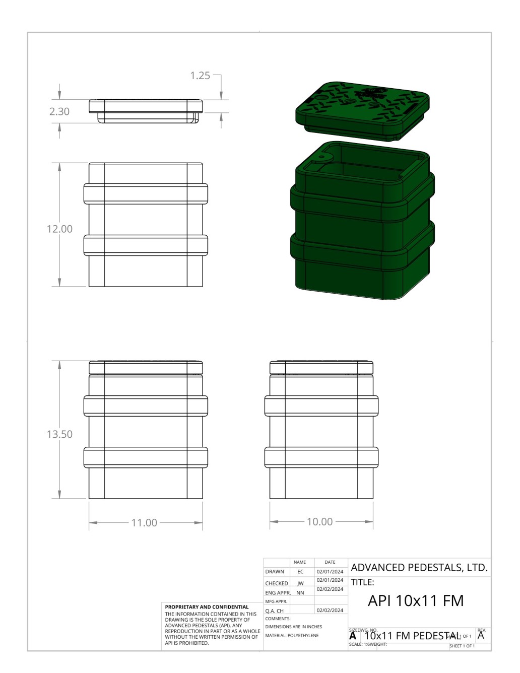 To ensure long-lasting durability, API uses advanced rotational molding technology and prime polyethylene to create reliable flush mount pedestals suitable for a wide range of utility applications. The quality polyethylene boasts a high strength-to-weight ratio allowing for lightweight yet strong results, with uniform material thickness in high-stress areas. The combination of quality material and expert design ensures these pedestals will perform exactly as expected over their entire lifespan.